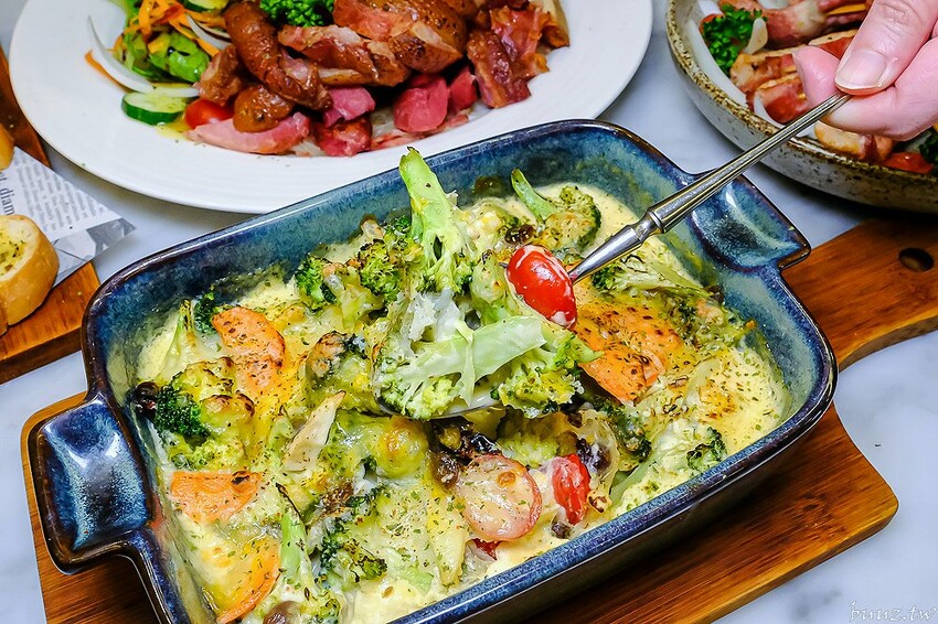 焗烤蔬菜奶油白醬,裡面有花椰菜、杏鮑菇、紅蘿蔔、洋蔥、番茄、玉米筍及甜豆等蔬菜,相當豐富,淋上鮮奶油再鋪上起司乳酪絲後去焗烤。