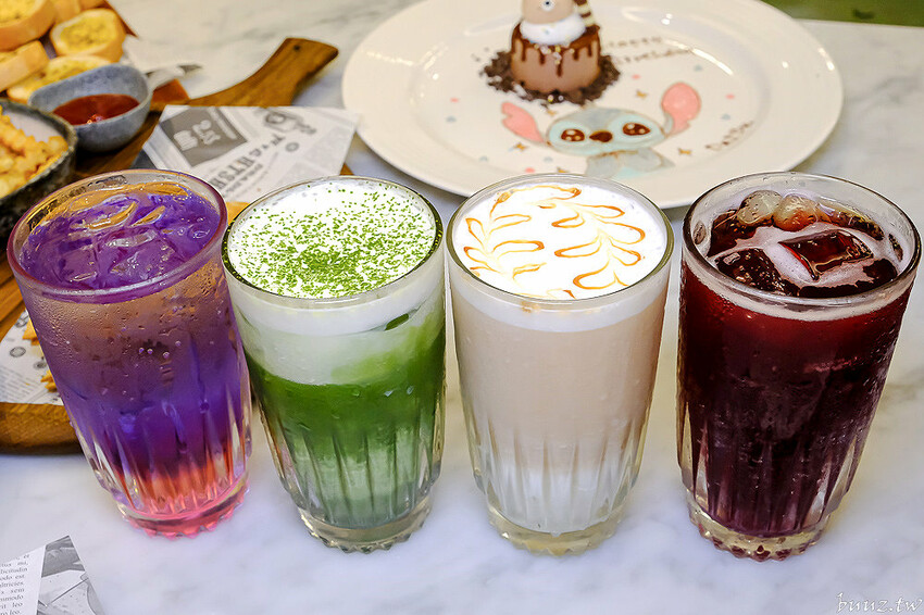 如果想要更換其他單杯飲品可以折抵5折,送上來的這四杯從左至右是粉紅玫瑰氣泡飲、日本靜岡抹茶歐蕾、伯爵鮮奶茶及黑森林果粒茶,漸層系的特調飲品繽紛亮麗。