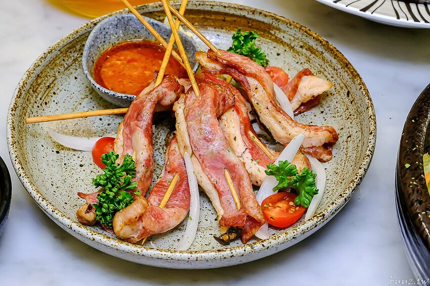 培根雞肉串則是在雞胸肉串外面再包覆一層培根肉,搭配的沾醬是微辣的沙嗲醬,雞胸肉本身氣味較淡,有了培根肉搭配下多了些油脂香甜味。
