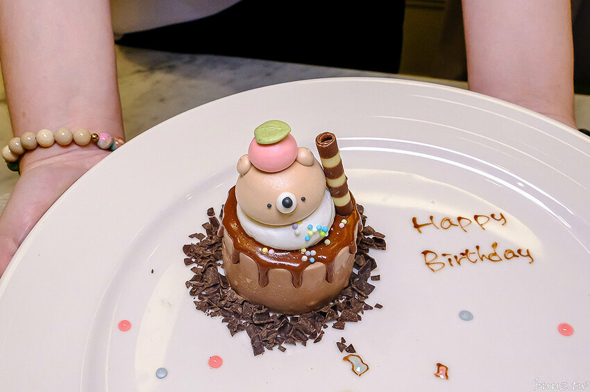 剛剛有看到甜點盤上都有彩繪圖案,這個客製化畫盤也是雛菊見的一項特色,只要是當月壽星點「分享餐」或「鬆餅組合套餐」,出示證件即可免費兌換客製化生日慕斯蛋糕。
