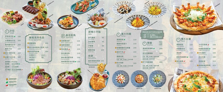 店內的餐點主要是沙拉、義大利麵、燉飯、薄片披薩等義式料理,搭配開胃菜最佳配角、飲品及甜點,飲料也有分茶品、咖啡、鮮乳飲及冰沙等。