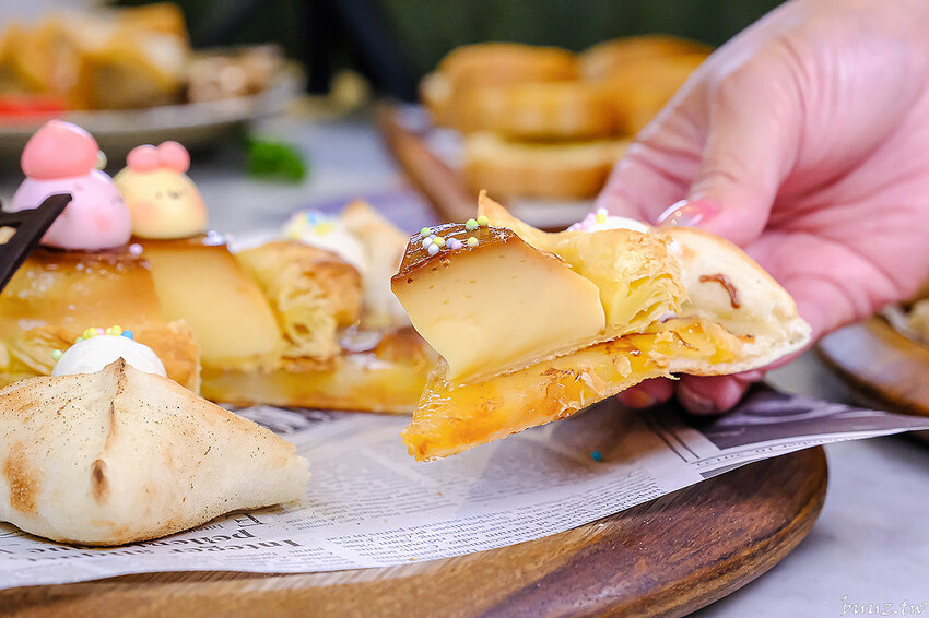 酥皮烤布丁熊熊派對也是讓人愛不釋手,基底是乳酪起司披薩,中間是現烤的酥皮再搭一顆台南銀波布丁,周圍還有著手工製作的馬林糖點綴。