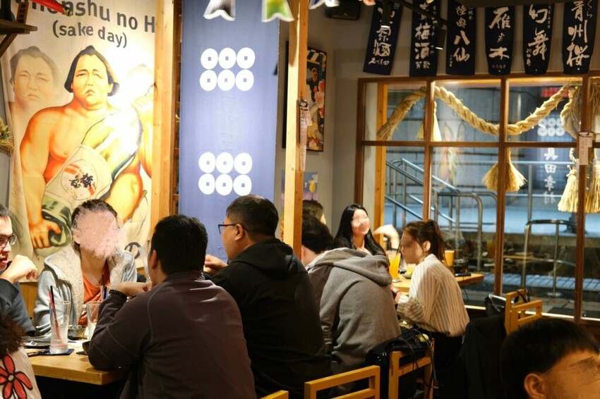 ▼【蔦燒日式居酒屋士林店】承襲店外的日式氛圍,以灰色系牆面揉合木質調桌椅,搭配各式各樣的旗幟及藝術品,營造出充滿懷舊日式的江戶風格。