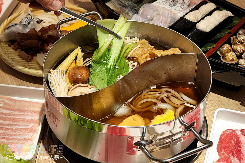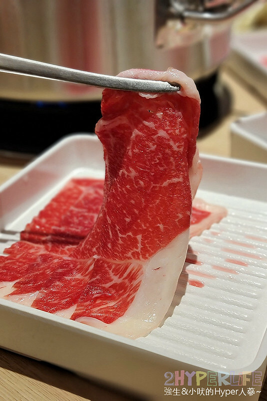 直接來個鴛鴦鍋滿足二種湯頭口味,這天我們選擇剝皮辣椒搭配壽喜鍋,而頂極的肉品就有五種,包含:安格斯極黑和牛;美國嫩肩牛小排;澳洲和牛沙朗心;西班牙松阪豬;伊比利梅花豬。當然一次先來一輪了