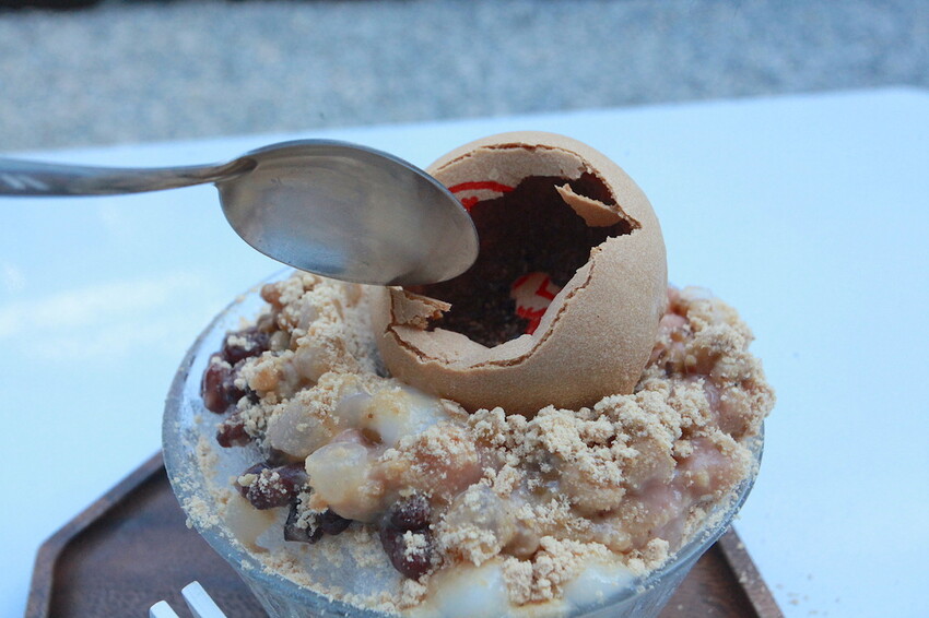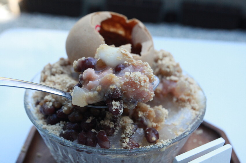 底部是刨冰與上頭有五樣配料,還有一粒台南特色椪餅,這椪餅有點厚實不容易敲破。