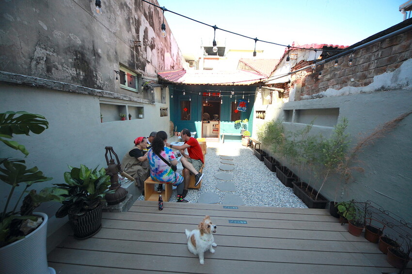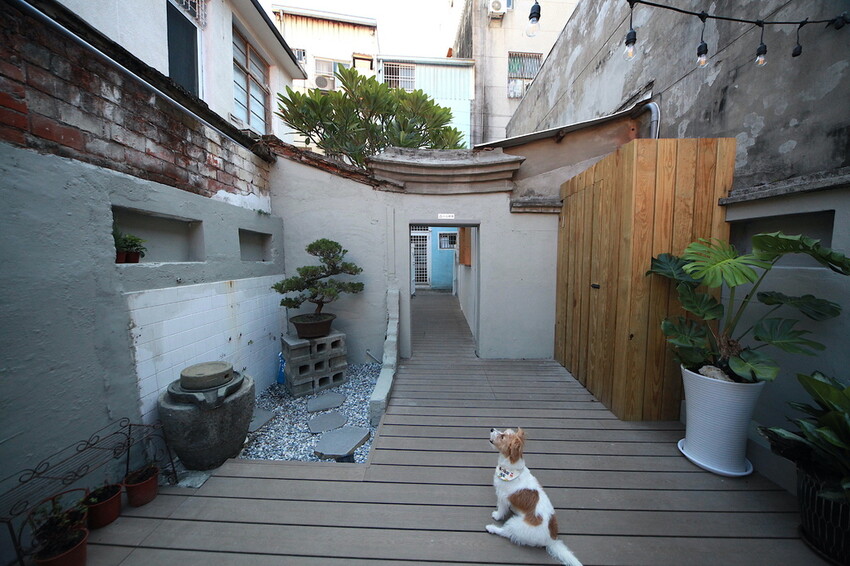 走進是鋪滿石子前院打造室外用餐區,眼前這隻就是店狗可愛的米妮。