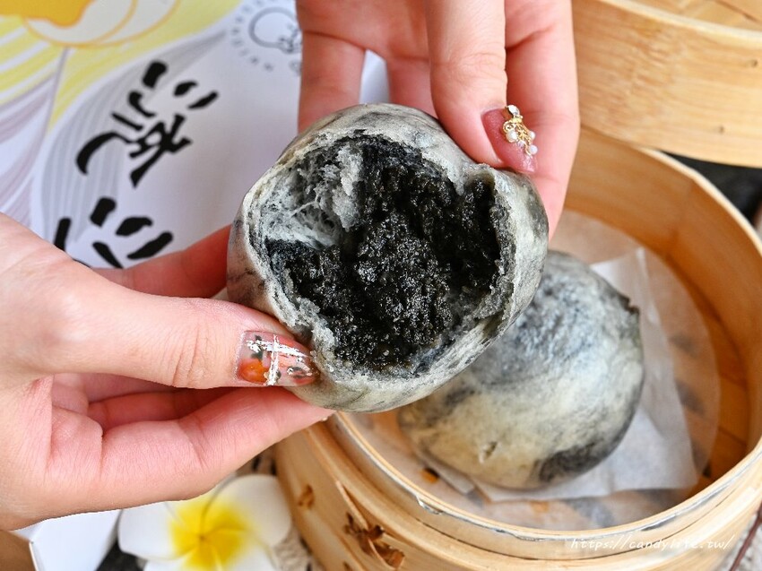 這款芝麻包也太美了吧,外皮有著美美的大理石紋路,內餡採用頂級的黑芝麻粉慢火炒香,再加入少量奶水增添香氣,外皮依舊Q彈,內餡芝麻香氣四溢,吃起來不會讓人覺得甜膩,就連長輩們也很喜歡,是說吃完這款黑金芝麻流沙包可記得要漱漱口,免得牙齒黑壓壓的無法見人呀(笑)