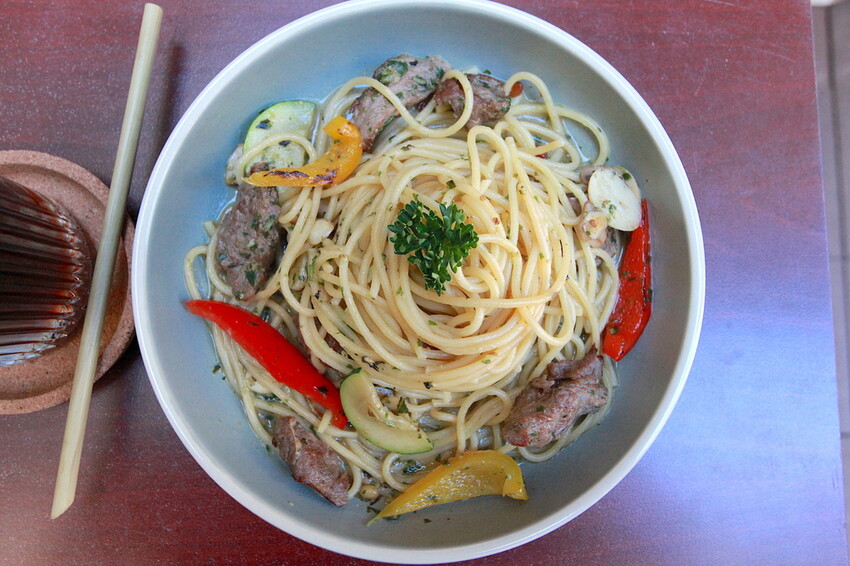 這義大利麵有節瓜、紅椒、黃椒及蘑菇的配料,拍照時可聞到九層塔香氣真香啊!