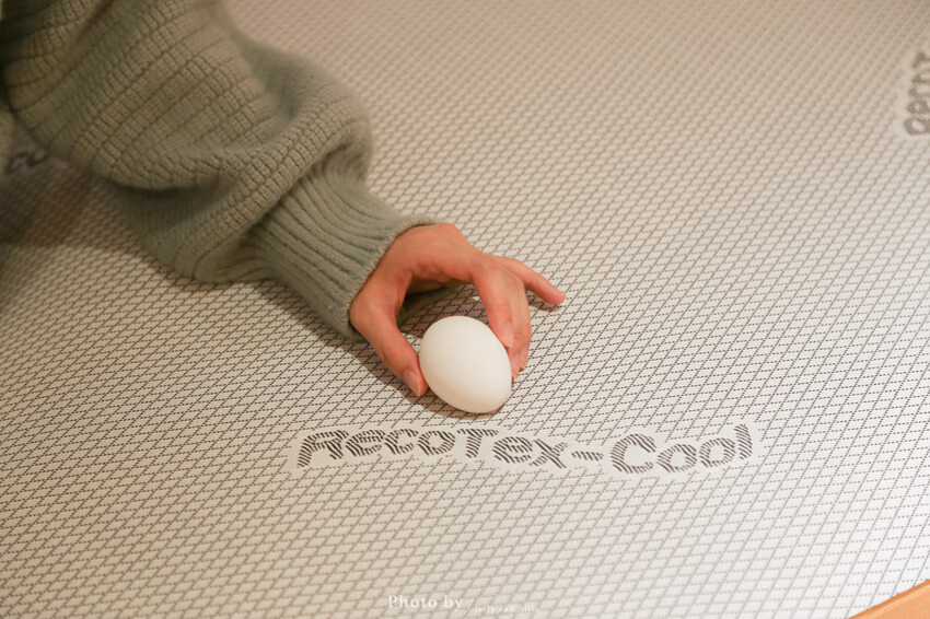 相較於大部分常見的床墊都是以獨立筒來製成支撐層,威斯汀的床墊不含任何獨立筒,身體的重量完全被分散到床墊中!每一張床墊上甚至都放了一顆生雞蛋讓消費者們坐坐看,Jeffy當時還背著小橘子,小心翼翼地坐下去,深怕一不小心把蛋用破了,結果後來雞蛋完全沒有破,扎扎實實地被壓進床墊中!老闆說這就像我們在睡覺一樣,床墊雖然是硬的,卻不會壓迫到身體的神經。