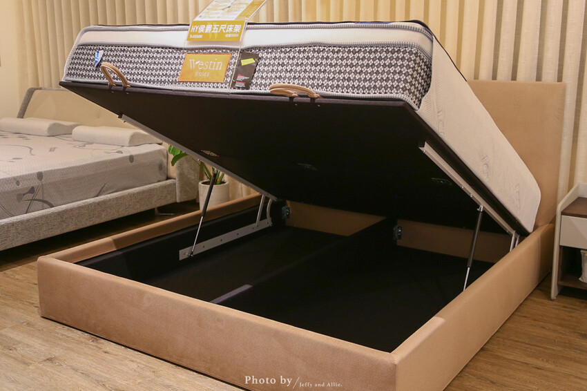 除了床墊之外,一組富有質感的床架肯定也是需要的啦!在現在小坪數家庭越來越多的情況,收納空間顯得十分重要!不同於以往的抽屜式的收納,威斯汀有一款床架可以將整張床墊上拉,在空間的運用上更是淋漓盡致。