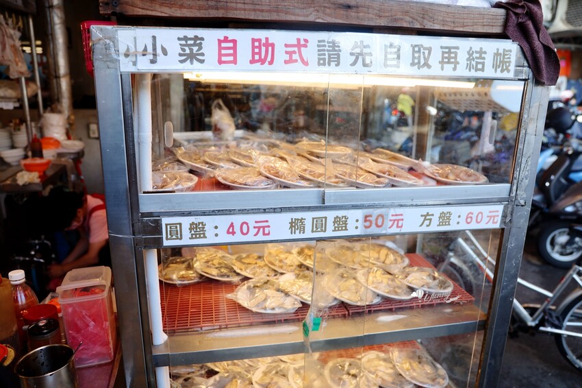 在老曹餛飩的門口,放上了許多小菜,可供客人自行選用。先拿了小菜,才一併結帳,結完帳就可以先拿至座位上用餐。