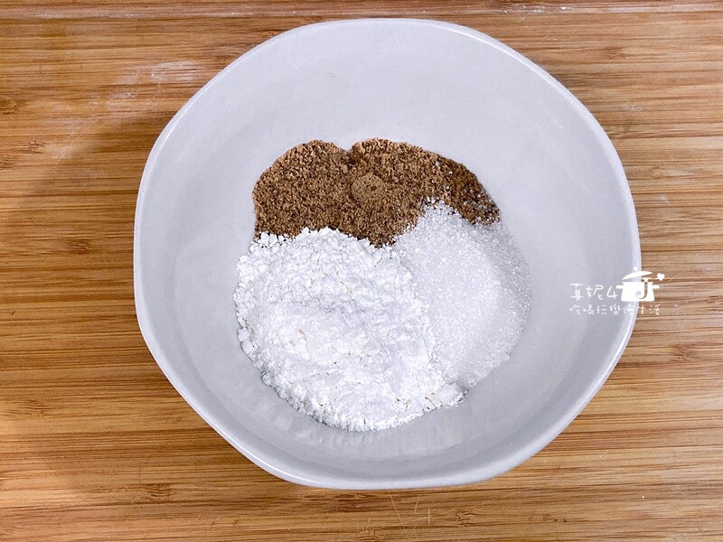 4.餡心材料先用筷子把紅糖/細砂糖/麵粉先攪拌混合再加入芝麻混拌