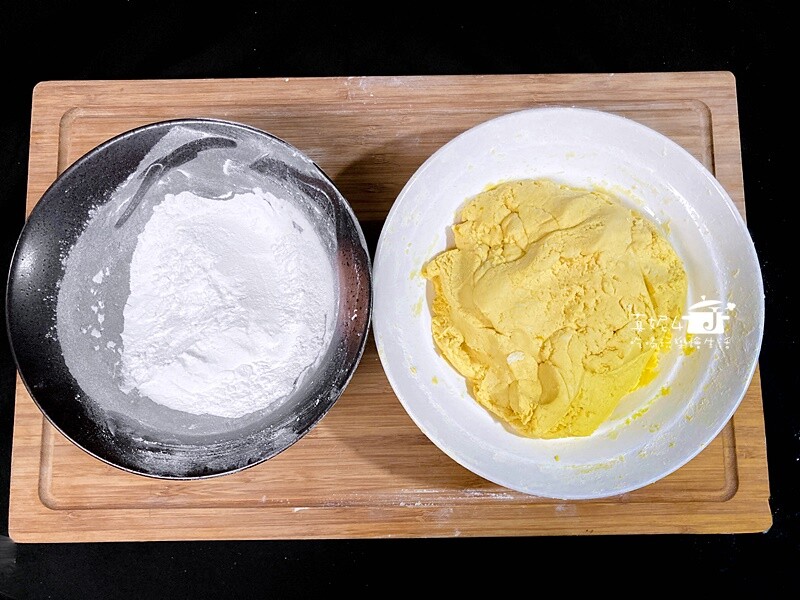 南瓜泥和糯米粉拌合到成糰不會黏手的狀態就可以了(右邊)