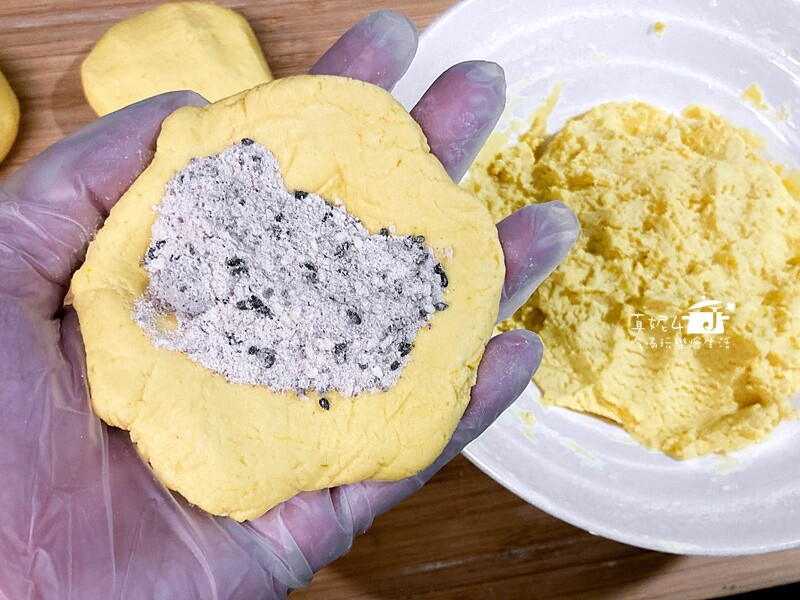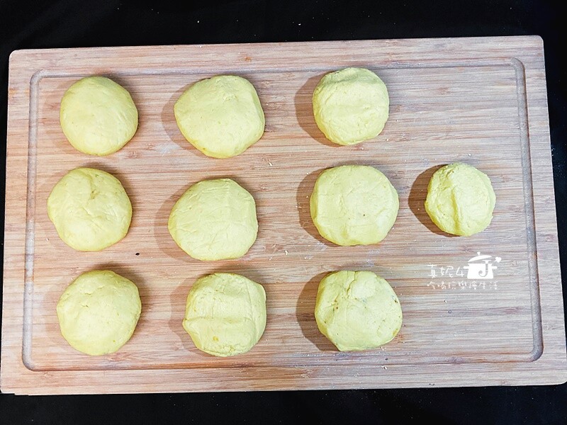 這份食譜完成的南瓜麵糰有600g,糖餡大約120g,我各以10等份的比例來操作