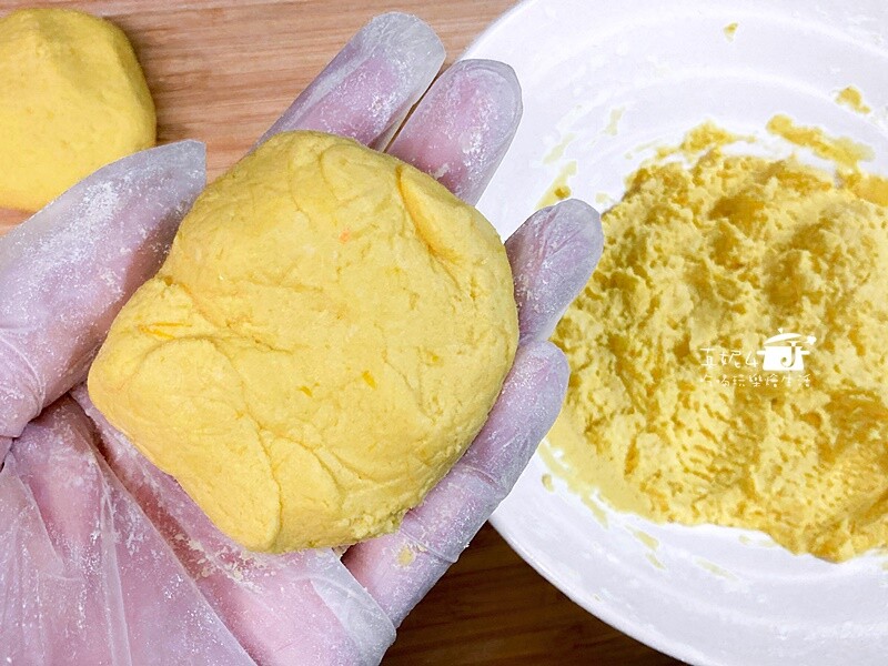再來是南瓜泥和糯米粉的吃水速度不一樣,要分次混拌才不會失手