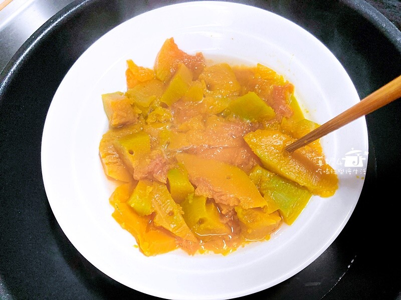 水開後用大火蒸,切小塊的南瓜大約10分鐘就能軟透了,筷子能輕鬆戳穿每一小塊就已經熟透了