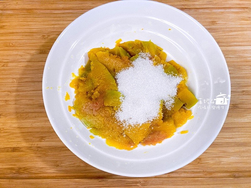 蒸熟的南瓜會出水,把多餘的水倒掉後趁熱拌入細砂糖