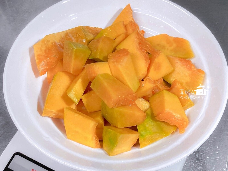 我準備的南瓜是450g,去皮去囊去籽後剩下375g,蒸熟倒掉水剩下370g