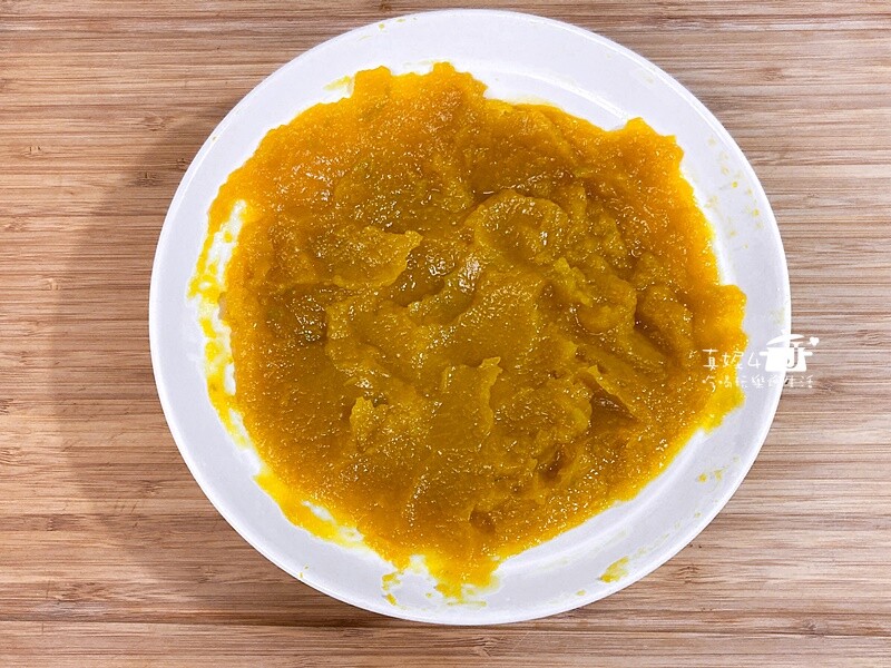 拌入糖的南瓜泥看起來有點濕,放涼後濕潤的糖水會被南瓜纖維吸收掉