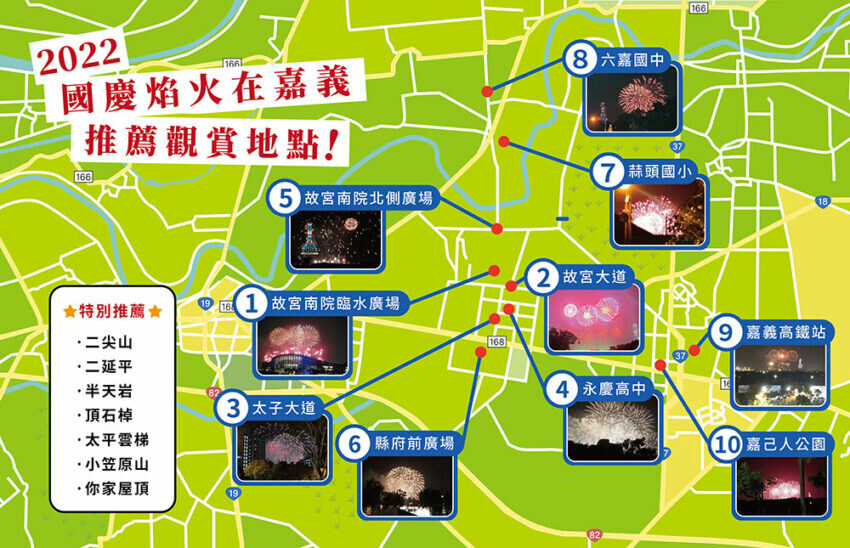 本次活動近100公頃範圍,足以容納27萬人,3處大型LED螢幕轉播,官網發佈10大絕佳觀賞地點(故宮南院臨水廣場、故宮大道、太子大道、永慶高中、故宮南院北側廣場、縣府前廣場、蒜頭國小、六嘉國中、嘉義高鐵站、嘉己人公園),主要圍繞故宮南院附近廣場和大道上,少數幾個在人潮稀少的校區(太平雲梯、二尖山、頂石棹、半天岩、二延平山、小笠原山),換句話說不只平原可觀賞國慶煙火,周遭山區也是不錯觀賞點,從高處看向煙火施放的故宮南院,肯定別有一番風味。