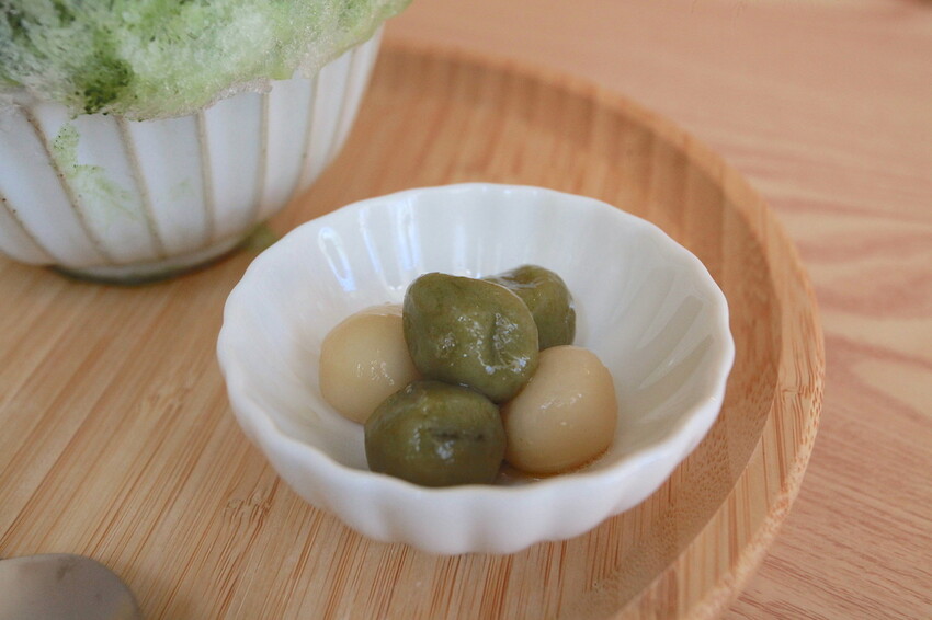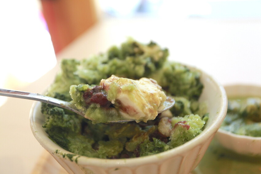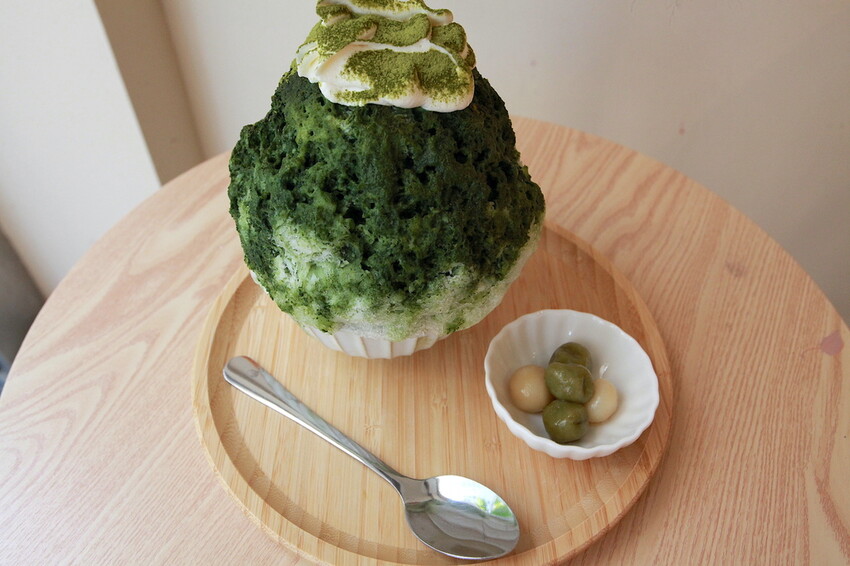 這日式抹茶刨冰擺盤很吸睛好拍,使用白色復古瓷碗來裝盛,整個刨冰堆積如山淋上抹茶糖漿。