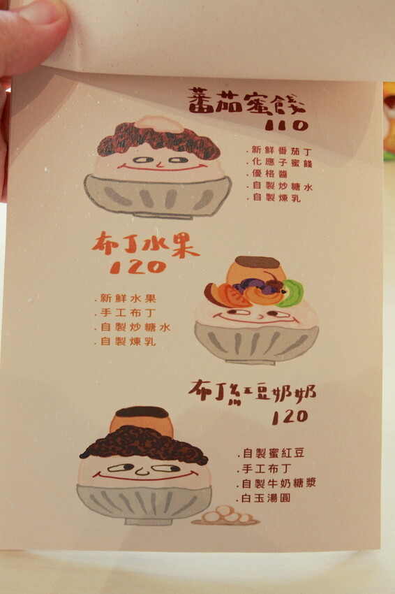 這厚厚一本手繪菜單供顧客參考,菜單上主要有刨冰類與飲品類,刨冰的種類很多定價合理範圍,每人低消是菜單上任一選項。