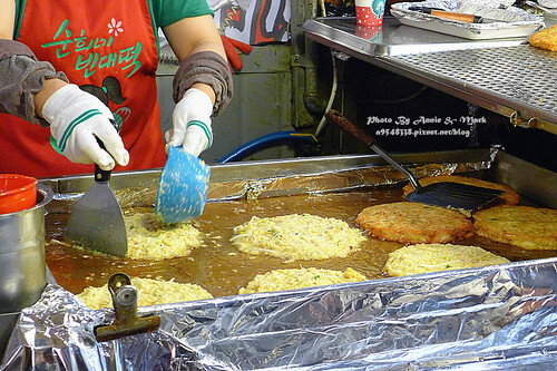 所以簡單來說,綠豆煎餅就是將綠豆磨碎拌上豆芽菜去油煎的囉!