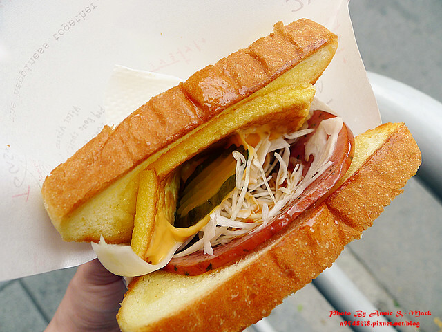 吐司煎得頗酥香,醬汁和台灣的美乃滋很不一樣,甜甜鹹鹹的,很好吃咧!
