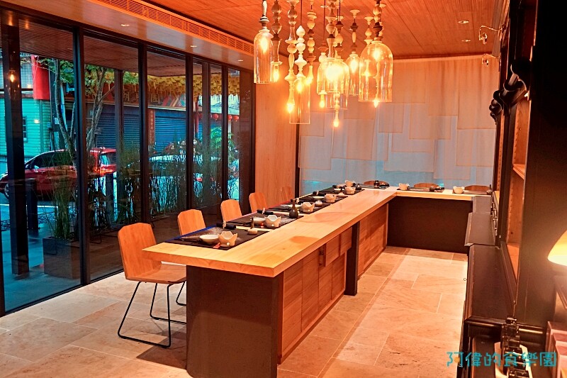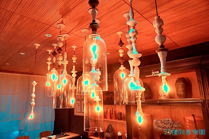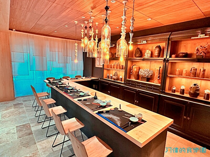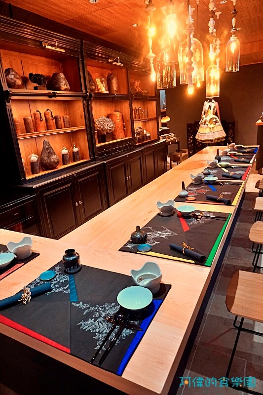 從窗簾到桌墊布,看得出都經過巧思。而整面牆的法國櫃,擺設法國藝術家創作法國人眼中的中國風格陶藝茶罐、天然礦石、火山陶藝作品及潘設計師的陶藝創作;歐洲燭台倒置的吊燈;牆上法國百年壓花﹔昭和時期的屏風,就像一間私人藝術展覽館,全都源自主理人的設計概念與私人收藏,不妨好好觀賞品味一番。