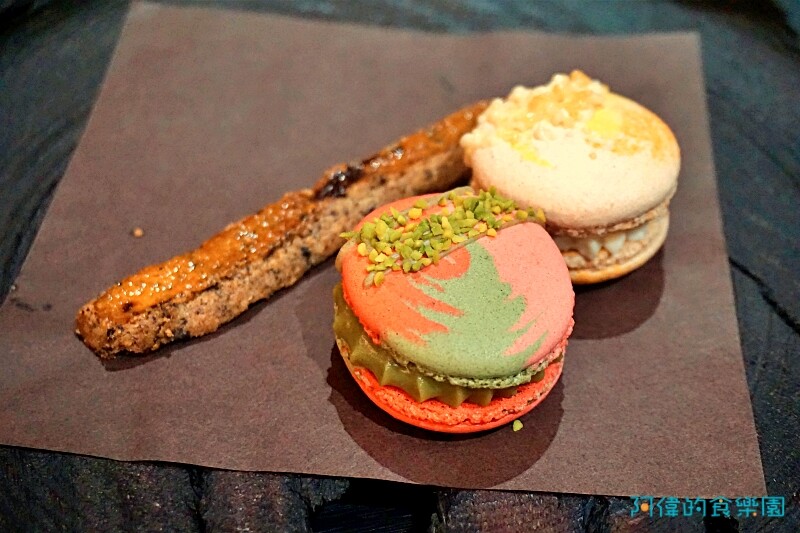 朋友吃的兩顆馬卡龍是橙花百香果跳跳糖、草莓開心果,那片餅乾則是椒鹽枸杞黑芝麻口味。