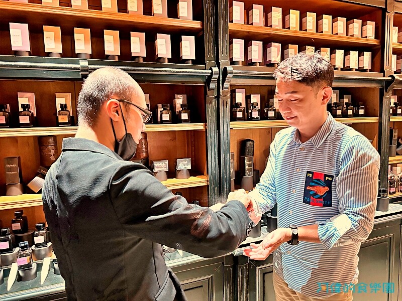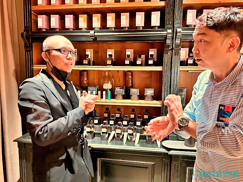 吃到一半,簡設計師現身,要我們走到櫃位旁,他依照每個人的特質調配適合的香氣。