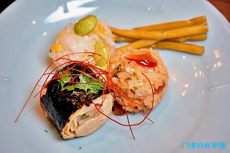 白色的是「毛豆豆皮飯團」、紅色的是「紅棗松子辣飯糰」、前方的是「煙燻豆皮捲」。一旁有醃蘆筍。