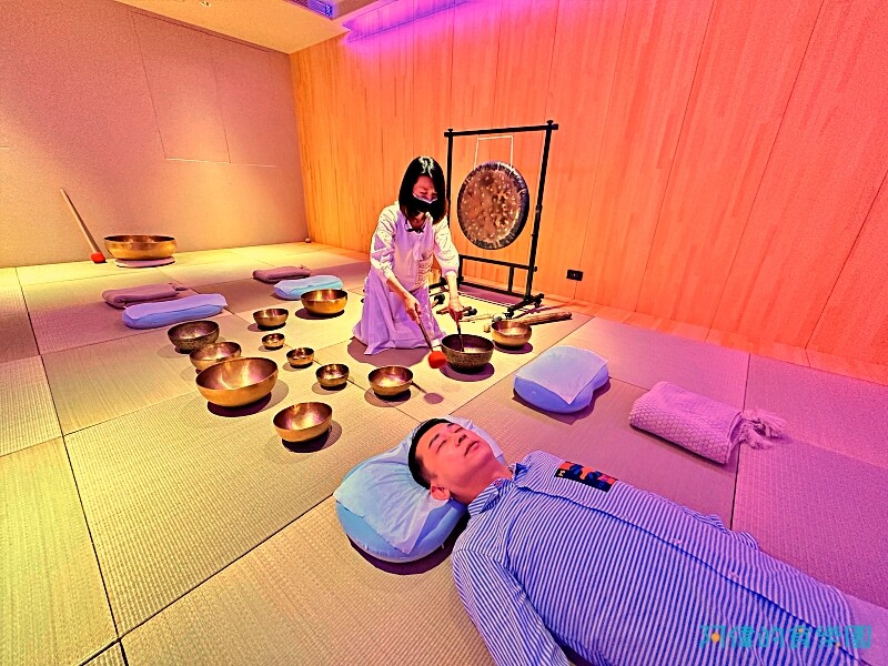 躺在禢禢米上,空氣中有淡淡的草蓆香,療癒師在一旁鎚打頌缽,她還會拿著頌缽在每個人的頭上附近,將共振聲響有如身歷聲一般環繞。