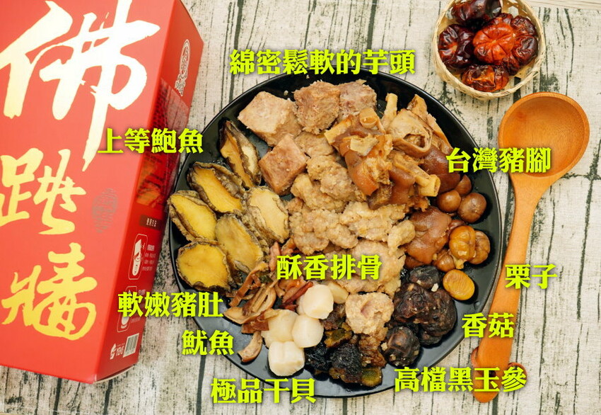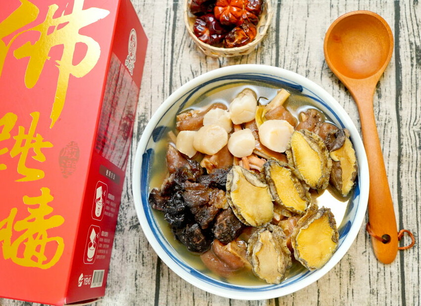 過年必備的經典年菜正是佛跳牆啦~~由品元堂所推出的「頂級豪華佛跳牆」更是送禮、自用都適合的年菜推薦!「品元堂 頂級豪華佛跳牆」外盒採用大紅色系搭配燙金字樣,大器又喜氣,而且又有安心認證,品質保障;內容物也很厲害,特別使用嚴選極品干貝、高檔黑玉參、上等鮑魚等珍饈加上炸芋頭、豬腳、豬肚、排骨酥、魷魚、香菇、栗子等多元食材搭配秘製雞湯,湯頭甘醇溫潤不會過於鹹重,不僅吃得到各種食材的特性,而且神複製現煮的風味,只要動動手指宅配到家,過年期間也能快速上桌、輕鬆享用,此外也很適合拿來宴客,不管面子、裡子都顧到啦!
