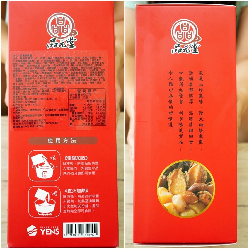 ▼品元堂從食材管理、加工、包裝到運送每一個環節都有嚴格把關,加上產品也有通過HACCP、ISO22000認證標章,不僅品質有保證,而且吃起來更加安心不少!盒側有詳細的成份、營養標示、製造商資訊等,食用方式也很簡單,解凍拆袋後放至電鍋蒸熟,或是直接直火加熱也可以!