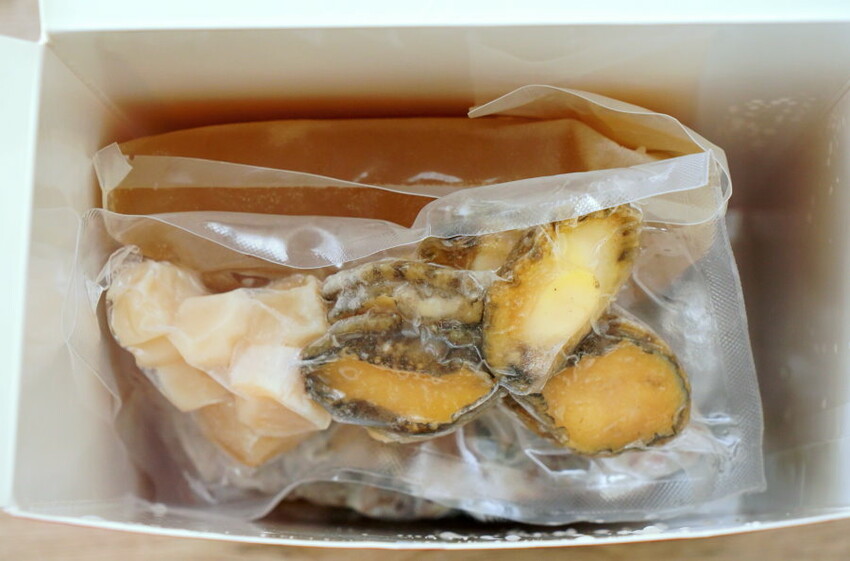 ▼佛跳牆配料分成兩包裝,光是固形物就有900g之多,一包是裝干貝、鮑魚等高檔食材,另外一包則是其他黑玉參、豬腳、排骨酥、芋頭、豬肚等食材,這樣也比較方便覆熱跟擺盤;湯頭通常都會多給一些,約有1500g,喝不完的話可以留下來煮粥,還可以多吃一餐(笑)!