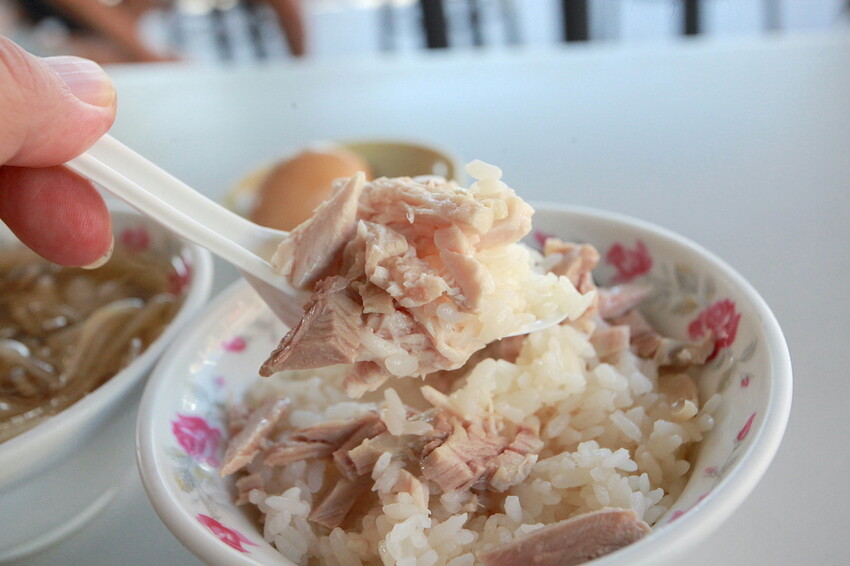 這碗火雞肉飯份量適中定價合理,白飯表面這火雞肉撕成條狀,旁邊放置小花瓜再淋上醬汁提味。