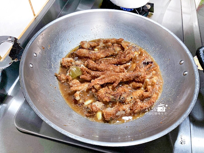 5.深鍋裡加入多一點份量的油,油溫加熱約120度後分批放入雞腳炸到金黃