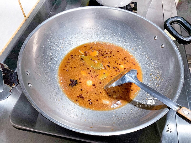 7.鍋裡一大匙油把薑.蒜.八角.花椒.月桂葉炒香