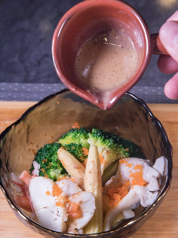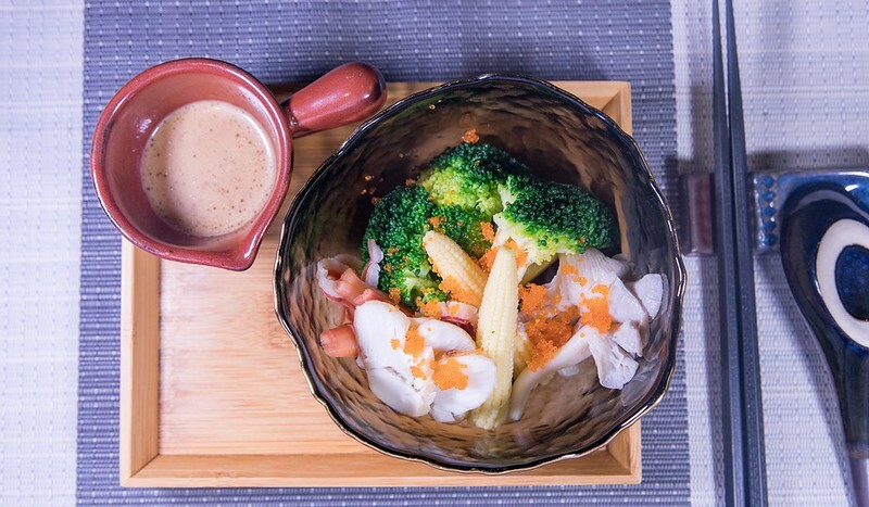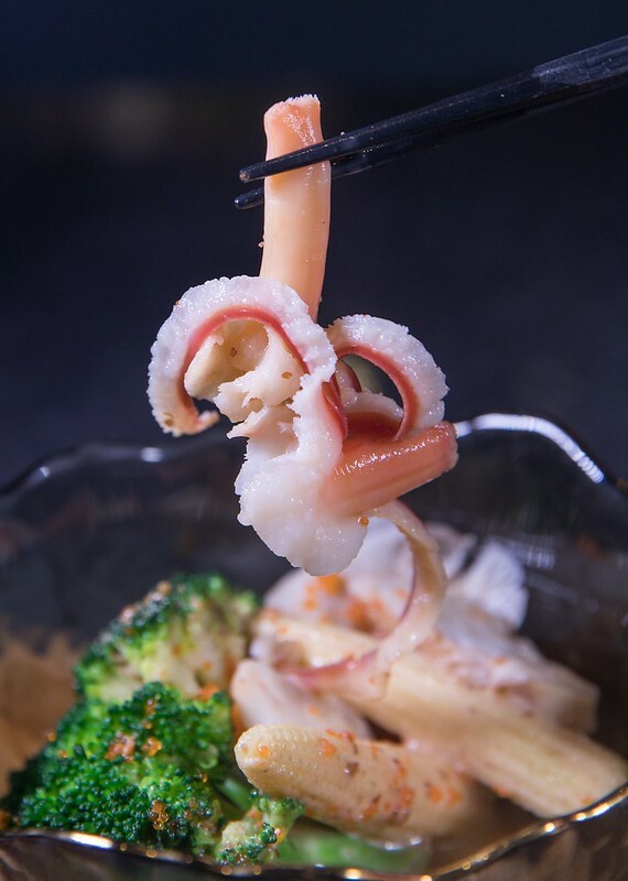 當天友人幫我預訂的是晚餐1880元的無菜單料理,另外還有1280、2500兩種價位。第一道前菜是涼拌海鮮時蔬,上菜的服務生都有確實的說了食材和簡略的作法(青花菜、秀珍菇、玉米筍、蘭花蚌、花枝膘,搭配胡麻醬)。