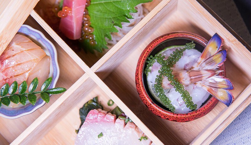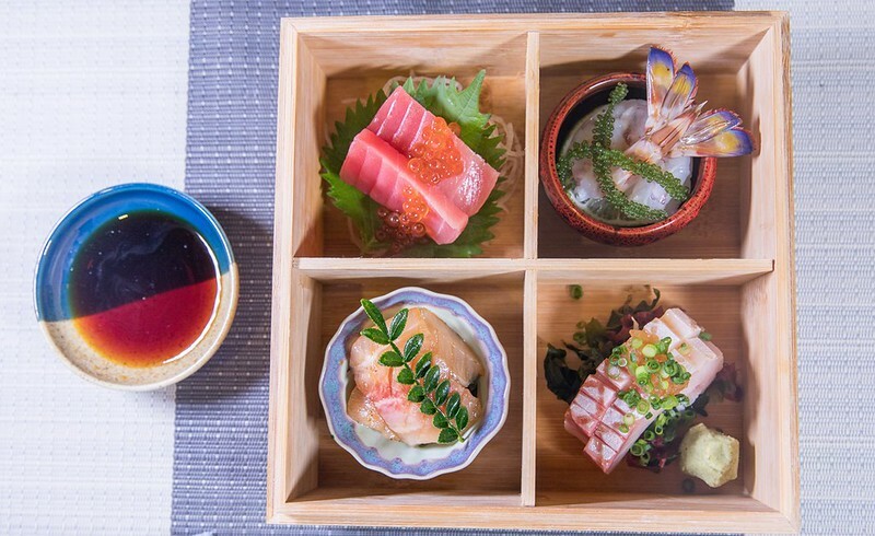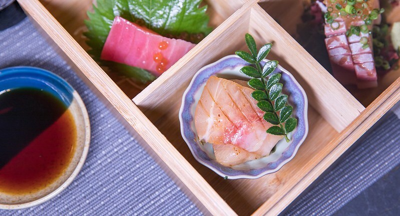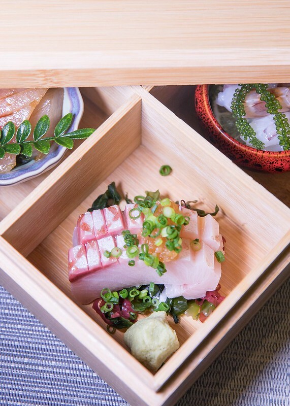 4種刺身(日本黑鮪魚中腹、炙燒青甘肚、旗魚、明蝦),我好喜歡這個生魚片造物用松花便當的概念裝盛,看起來就可愛的亂七八糟。