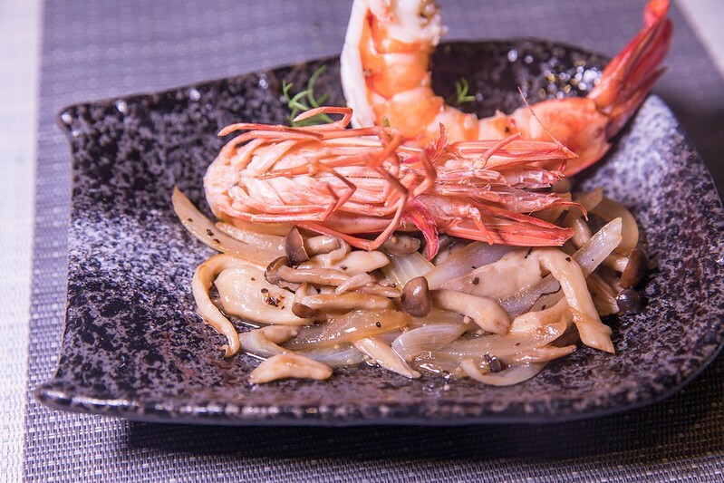 塩醬海虎蝦(洋蔥、鴻禧菇、海虎蝦、配塩醬),相對來說這煮過的海虎蝦口感顯得更為鮮脆,咬下略帶噴汁的肉甜也讓人滿意,就連蝦頭都很是美味,底下則舖了一層吸足了調味的鹽醬洋蔥、鴻禧菇,感覺上還有點像是黑胡椒的氣息,內行的就不會錯過。