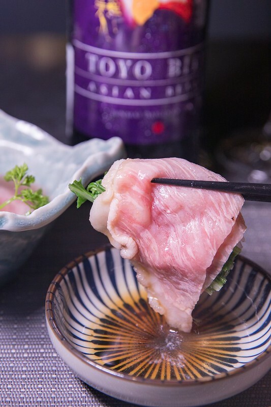 湯霜宮崎和牛(日本大蔥絲、京水菜、合牛片、配柚子醬)、湯霜(蓋上布以熱湯淋)的做法常見於日式魚肉的處理,運用到不宜過度烹調的日本和牛也相當合適。