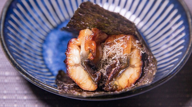 鰻魚餅(蒲燒鰻魚、白昆布絲、海苔),上菜時師傅說是鰻魚餅,我找了半天也沒發現餅在什麼地方,但才入口我就發現餅的意思,因為這鰻魚實在太Q了,那口感根本像野生的鱸鰻,中間還包了白昆布絲添色增味,蒲燒醬也烤到恰到好處,香而不搶鰻魚的甜味,也沒有醬甜膩口的口感和味覺問題,真心覺得這鰻魚餅厲害的亂七八糟,絕絕對對可以拿來單賣饅魚飯了!!!