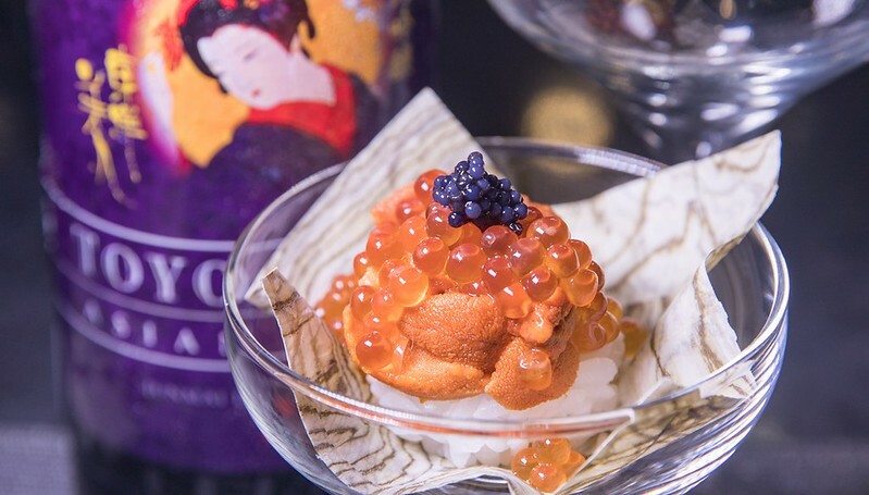 磯雪昆布海膽杯(磯雪昆布、海膽、鮭魚卵、魚子醬),這道光看就是視覺效果十足,沒半點道理會不好吃(笑),而且師傅還用了比較高貴的白昆布,讓昆布的甘甜更加圓潤,也不會像海苔那般搶戲。
