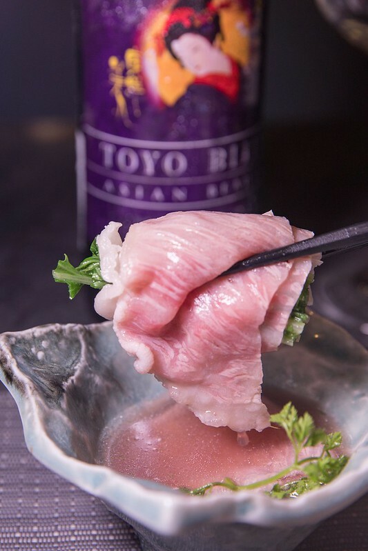 吃起來的口感有一點像涮涮鍋,只是過程更為精簡,和牛柔嫩的口感、油質的甜度也不會流失在鍋中,中間的大蔥絲、京水菜補足入口的飽嘴度,又適時中和了和牛的油膩,搭配酸甜的柚子醬也很得宜。因為有兩片,個人建議一片沾一片不要沾,那是兩種不同的享受,但一樣都好吃的亂八九糟。