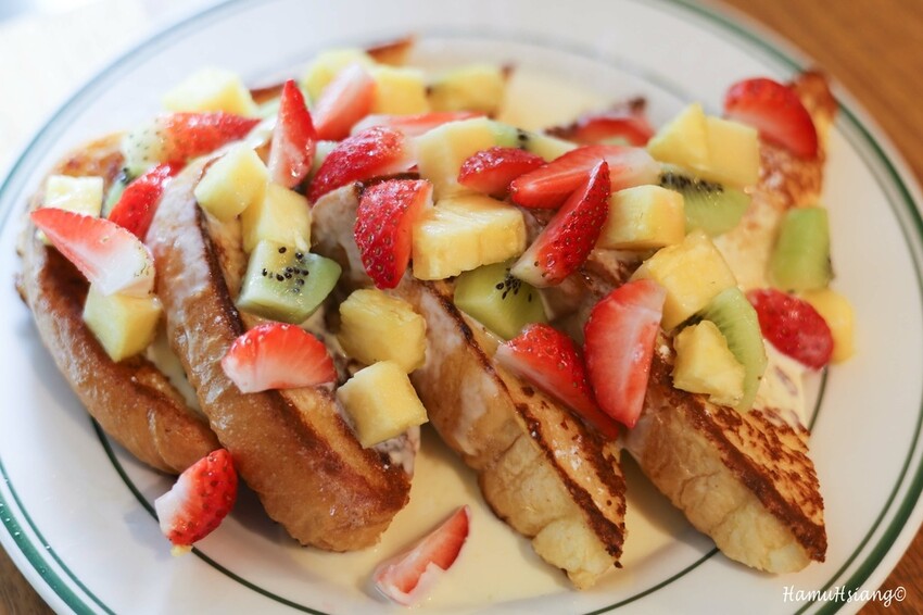 加上法式吐司很厚實,法式吐司內的奶香與糖的比例拿捏得很好,帶點微甜又飽水感,很扎實好吃