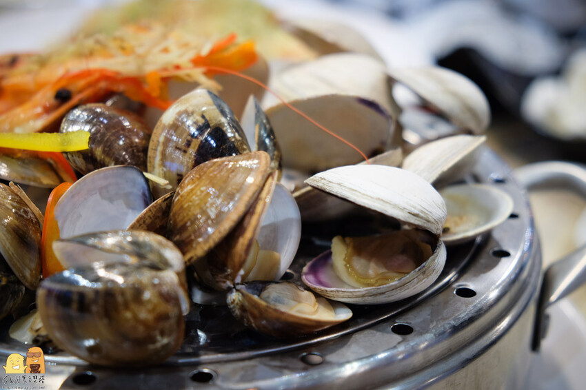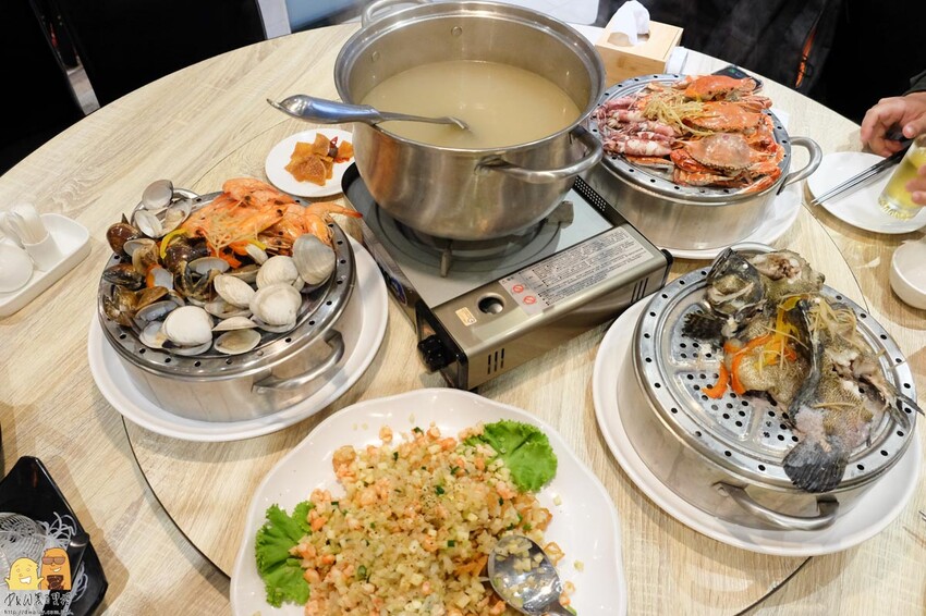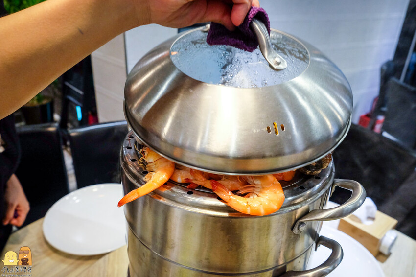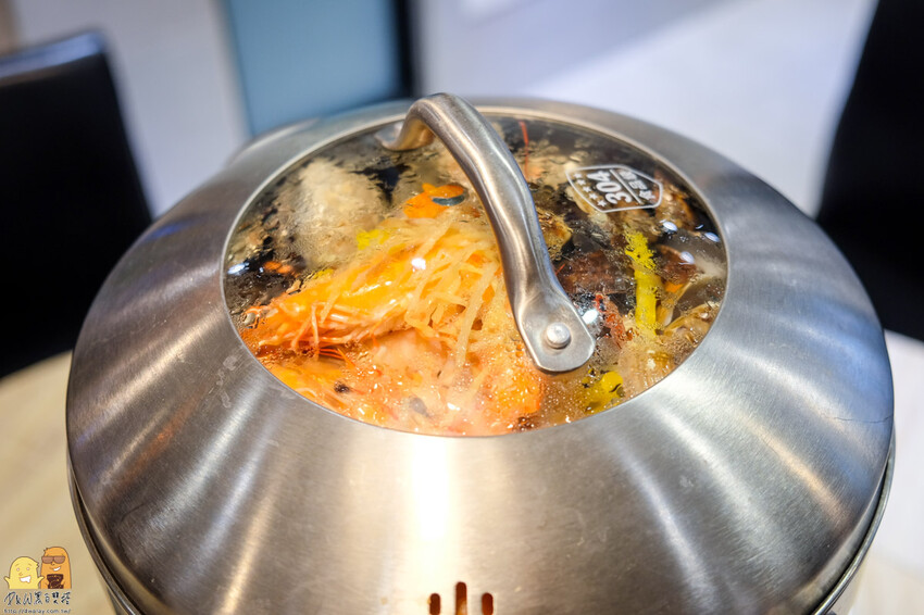這個蒸氣一噴出來,那鍋內滿滿的海鮮香氣瞬間撲鼻而來,坐在附近的饕客沒有一位不看我們這桌
