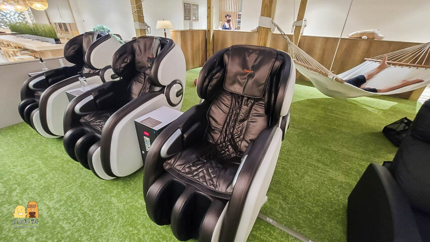 從最一進去的地方就是開闊的聚會空間,也有按摩椅跟吊床