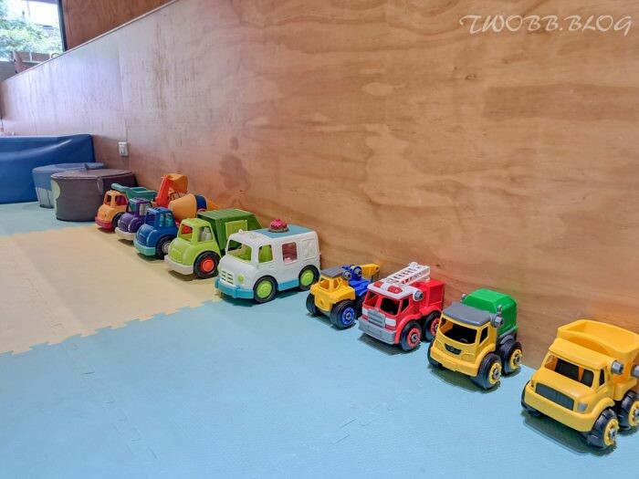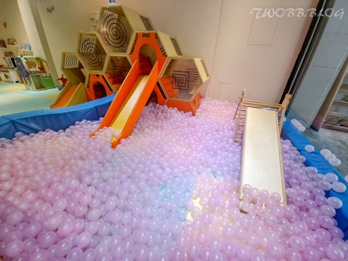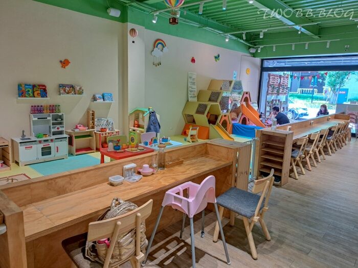 適合兩歲以下的一樓遊戲空間,皆有規劃動靜遊具,可讓小小孩悠遊於球池溜滑梯釋放大肌肉活動,也有家家酒扮演區及閱讀區。用餐位置也特別規劃能夠近距離觀望幼兒的區塊,這點相當貼心。